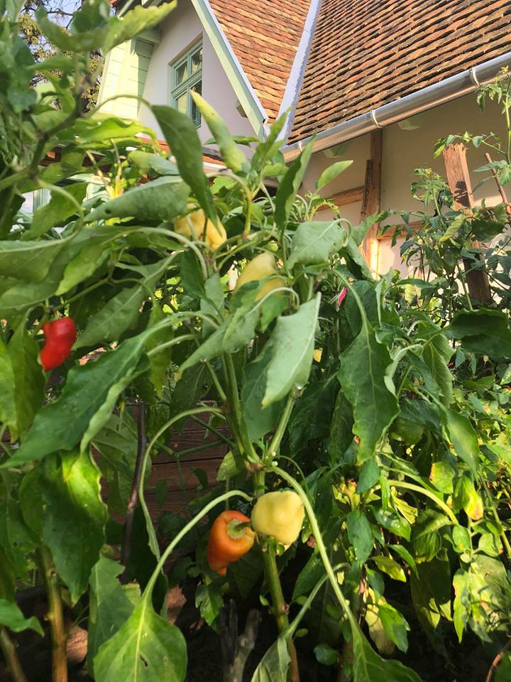 A kiemelt vetemény ágyások jól teljesítenek… Ontják a paradicsomot, a sok paprikát. Van padlizsán, mángold, zellergumó, vörös és lilahagyma, fűszer és limonádéba való növények… És volt már friss retek, zamatos szamóca… 4 négyzeméteren…