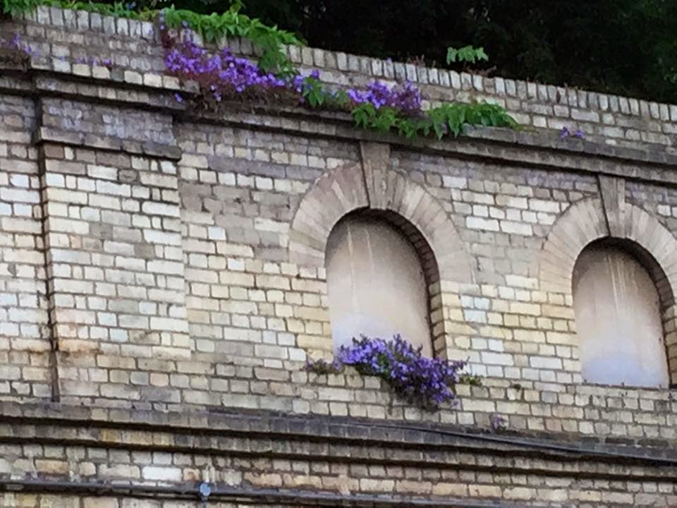 Az élet él és élni akar: Harangvirág (Campanula sp.) a téglafalon és a térkő burkolat fugájából előtörő kőrisfa (Fraxinus excelsior).