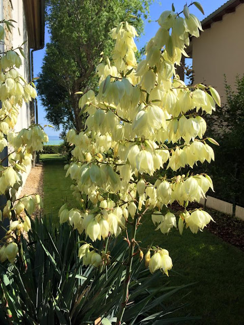 Mellettük fényképeztem le ezt a gyönyörűséges kerti pálmaliliomot (Yucca filamentosa):