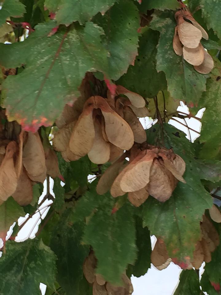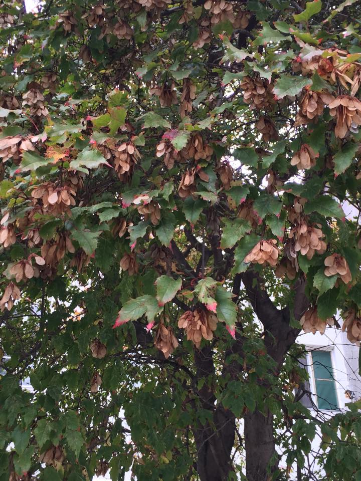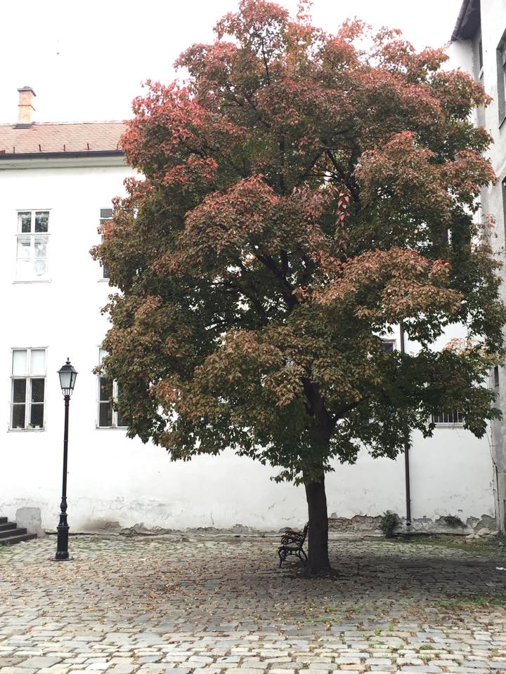 Tűzjuhar (Acer ginnala). Ritkán ültetett, lassan növő, de igen dekoratív juhar fajta, izzó vörös őszi lombszíneződéssel. Ez a formás idős példány Sopronban az ókori várfal egy darabja mellett díszlik, izzó ruháját kezdi felölteni.