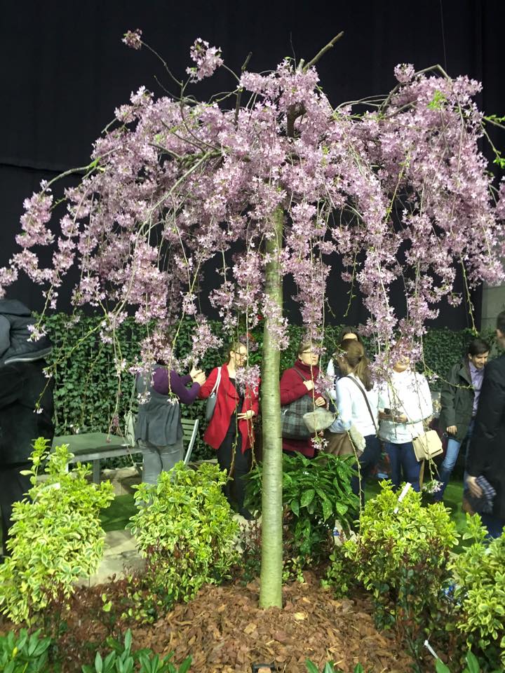 Csüngő japáncseresznye (Prunus yedoensis Shidare Yoshino) kis kompakt koronát nevelő csüngő ágrendszerű fa. A dúsan virágzó japán nemzeti növény termést nem hoz, virágzása idején káprázatosan fest. Mint itt ez az előhajtatott példány a Gardenexpo Makeosz standján.